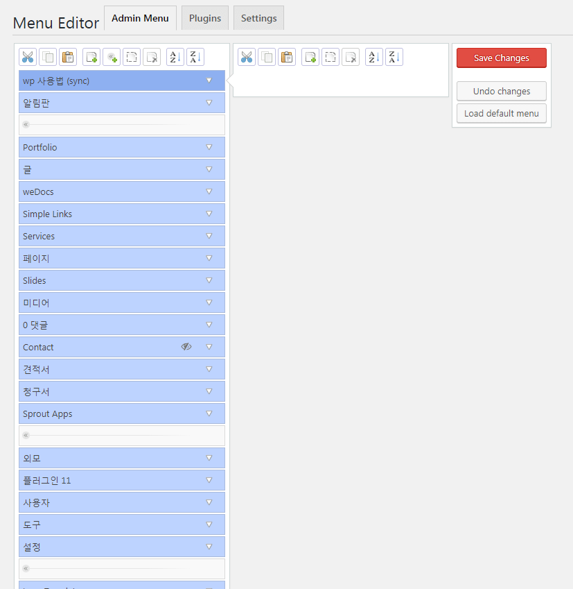 Admin Menu Editor (plugin) 메뉴의 순서, 이름, 노출 여부를 간단히 조작할 수 있는 플러그인 Admin Menu Editor UI상에서 보여질 모습을 보면서 컨트롤이 가능 Doc navigation유저 검색 키워드 추가 →