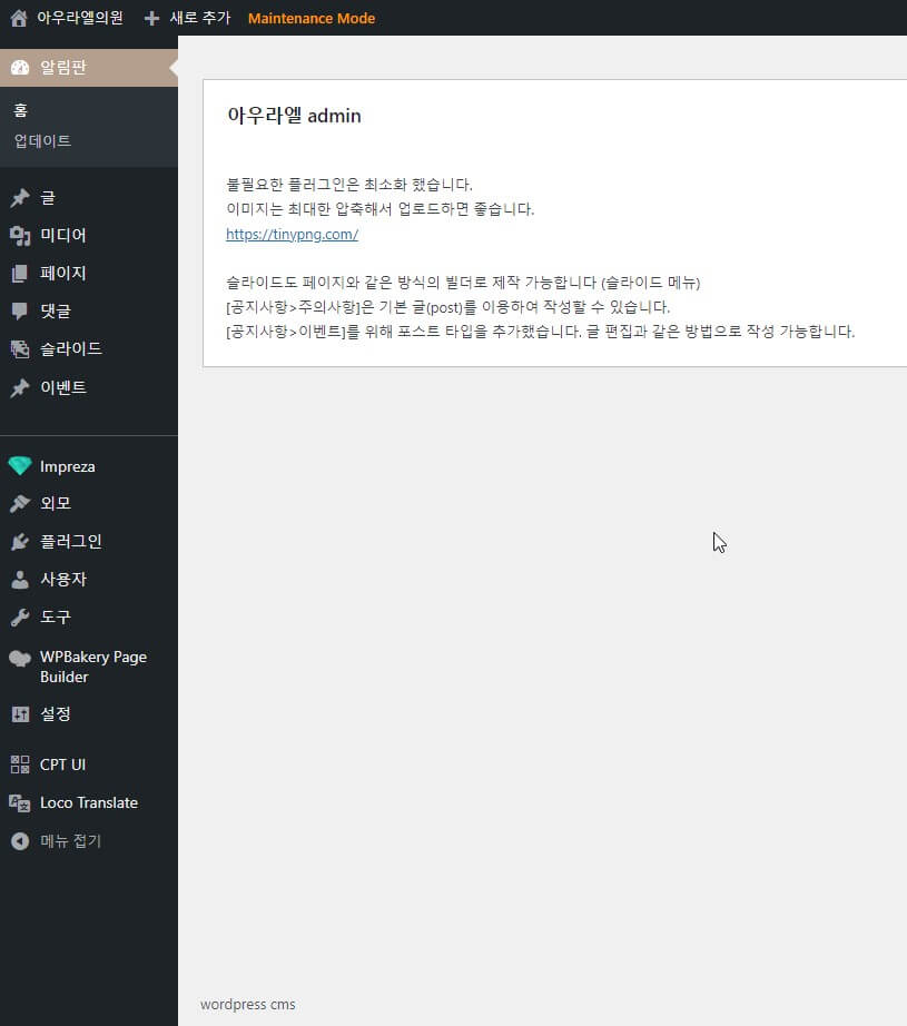 모든 콘텐츠는 워드프레스의 글 편집 방식을 활용하여 관리 (※ 기존 : 슬라이더, 게시판 플러그인 이용)